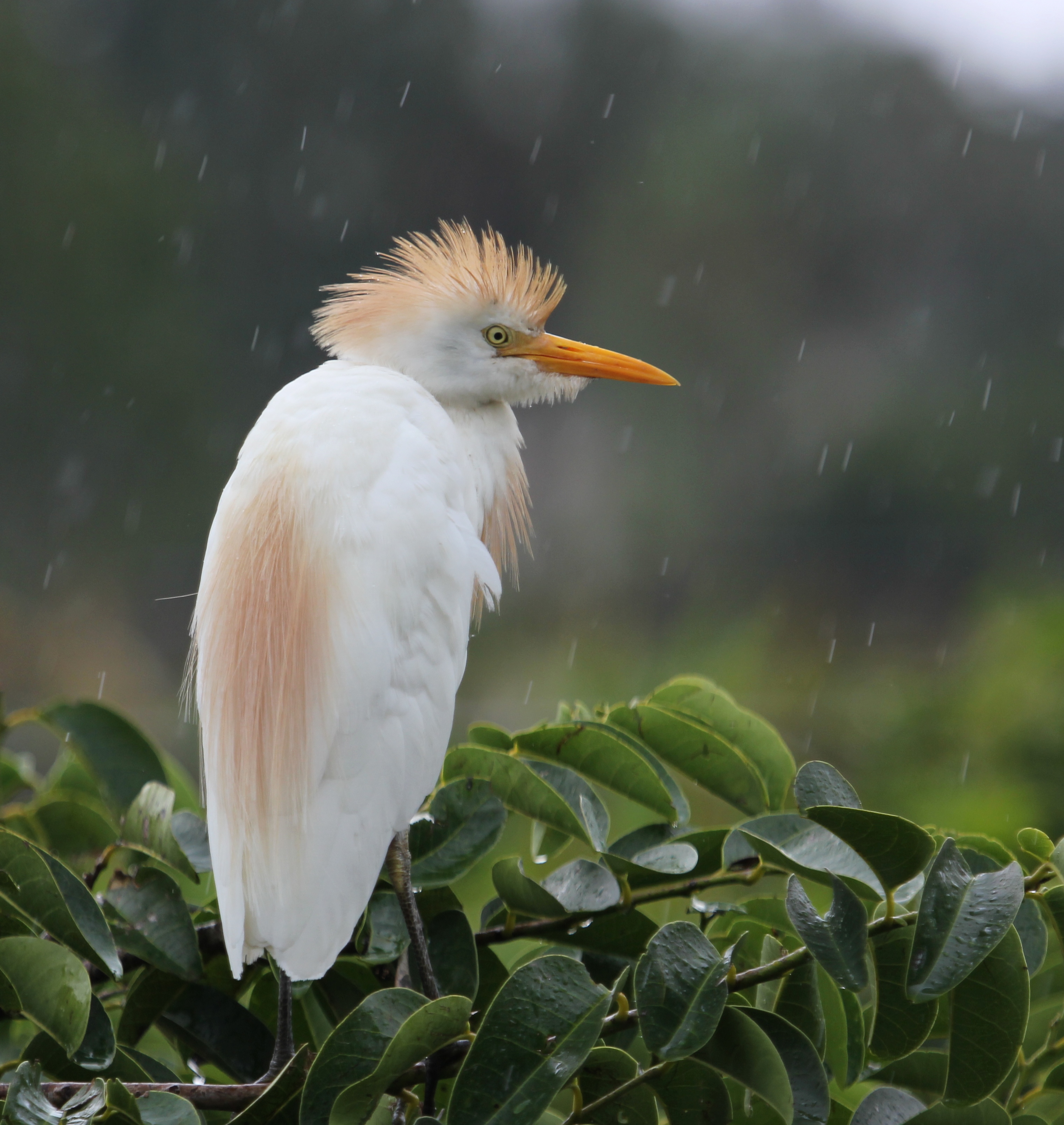 There were no other humans in sight on a recent lovely, warm summer morning when I went out – just the birds and me! Just the way I like it. A light, steady rain was falling, and this young Cattle Egret climbed to the top branch, trying to escape the bickering squawks of his tree island neighbors, the juvenile Snowy Egrets.