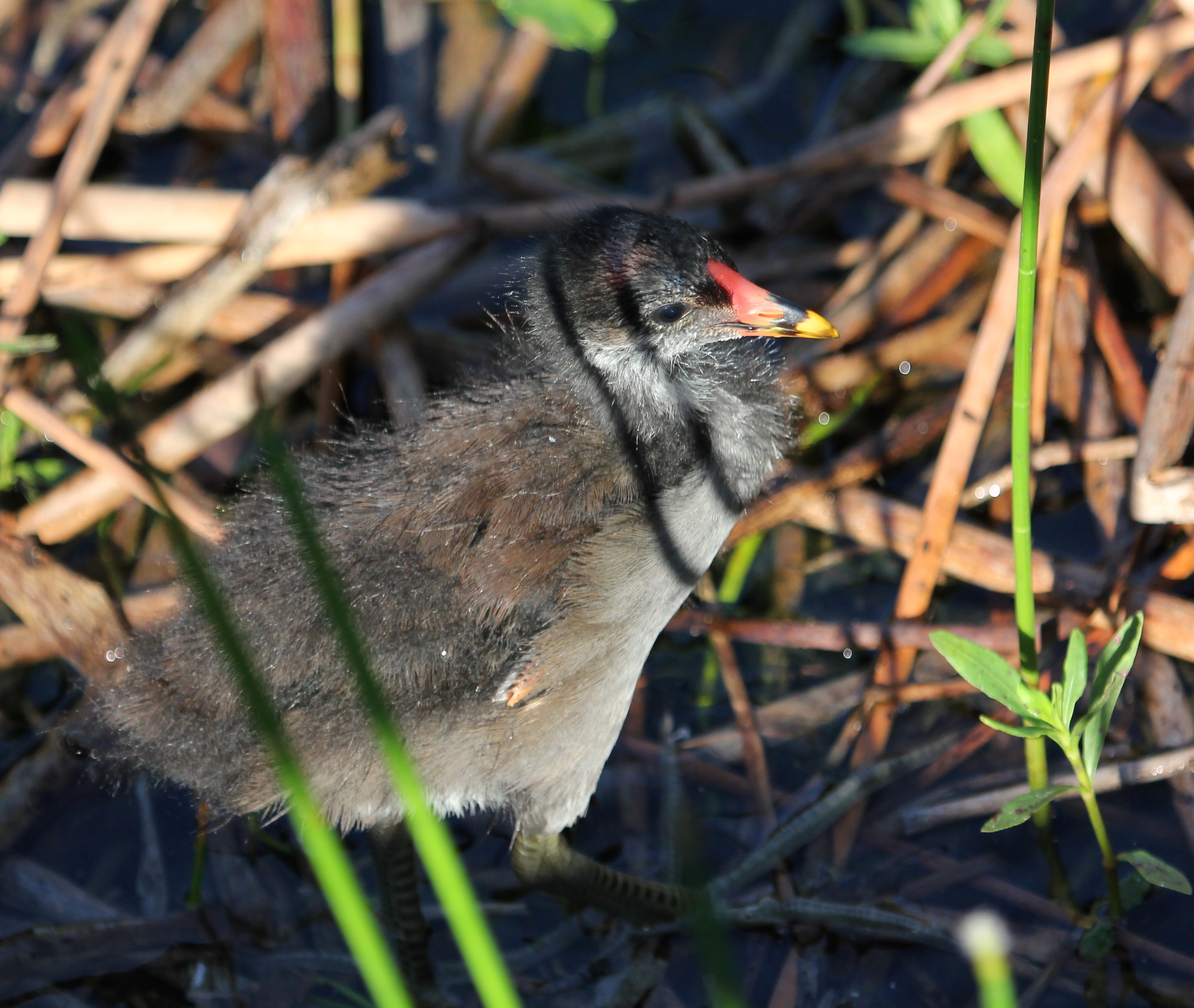 The Purple Gallinule is one of my favorite birds – luckily for me, they are very common in our wetlands!!  Like other Gallinule babies, they are just little balls of black fluff when they are born.  By mid-August, there were still a few groups of chicks toddling after their parents in the reeds and peeking out from their hiding places.  IMG_0538