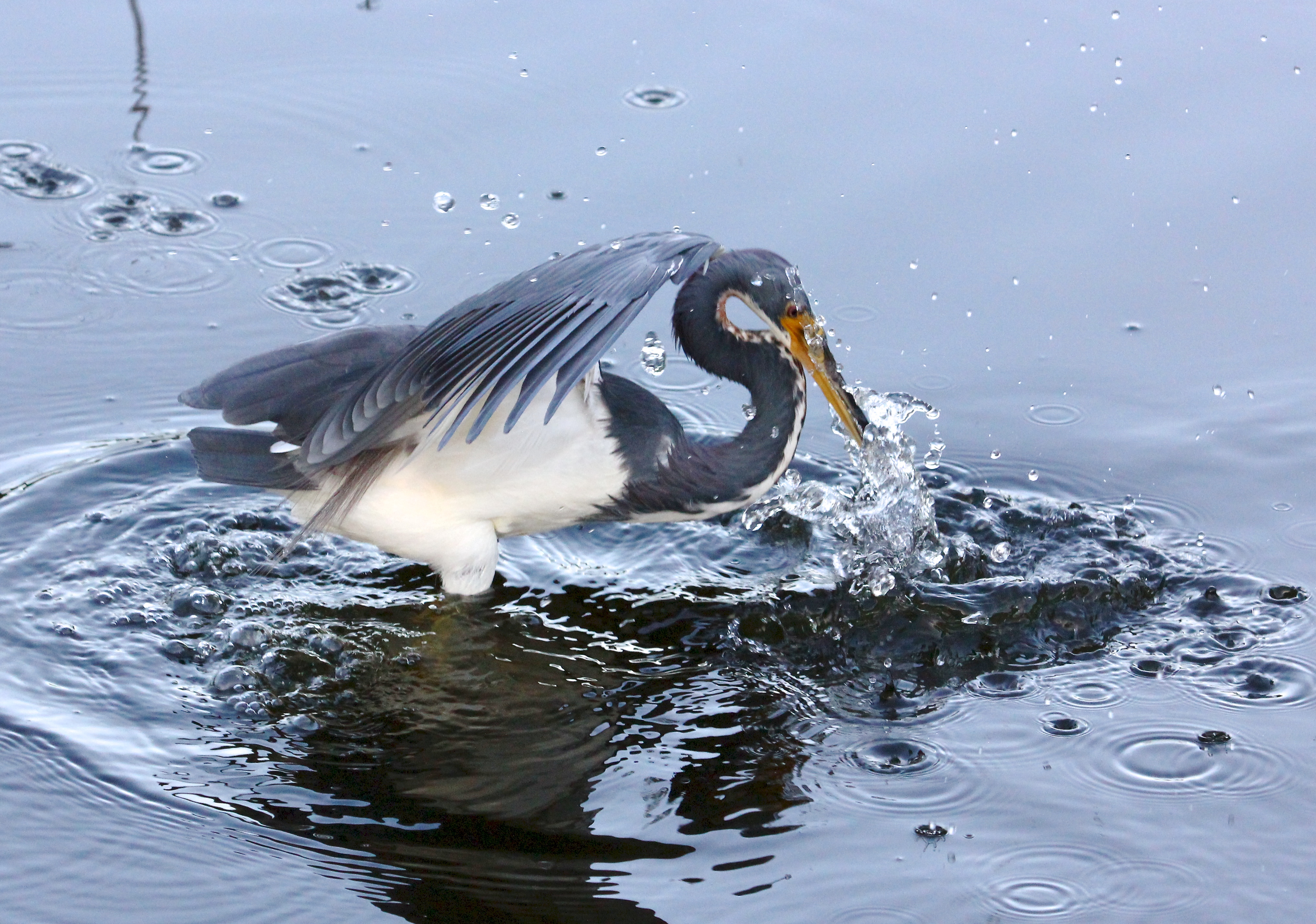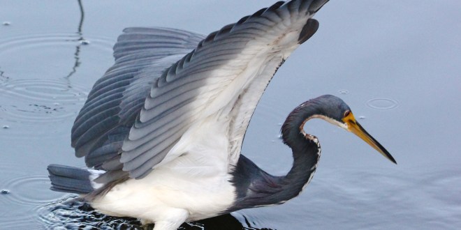 I love to watch Tri-colored Herons as they hunt in the shallow water – their technique is so showy! It’s no wonder they are so slender – they perform feats of acrobatics over and over again just to fill up on a meal of one teeny, tiny, little fish after another.