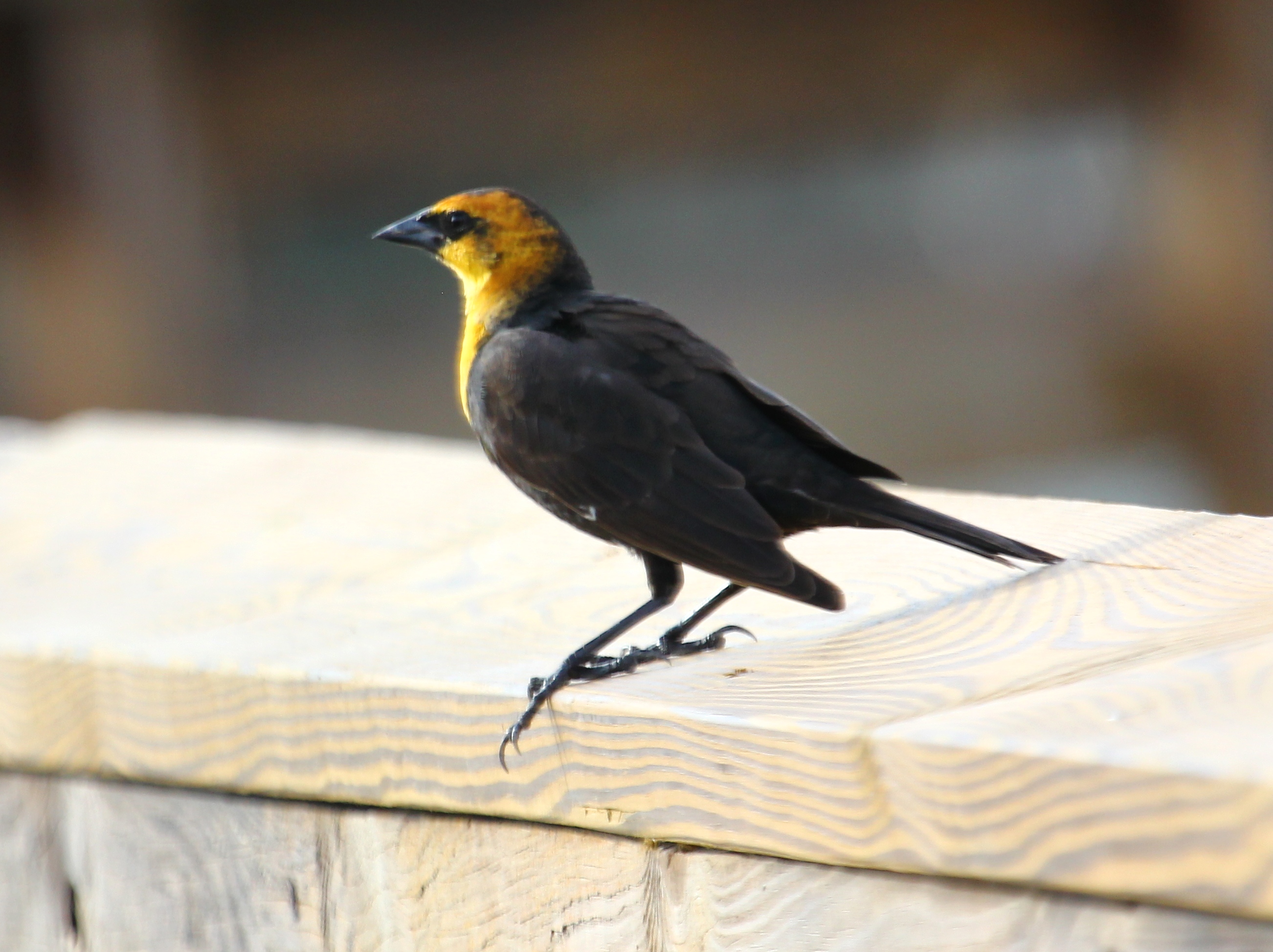 Today, the Yellow-headed Blackbird above popped up onto the railing and I was able to take this shot from a distance. I would have liked to get closer for a better photo, but I was afraid he’d take off. What a treat!