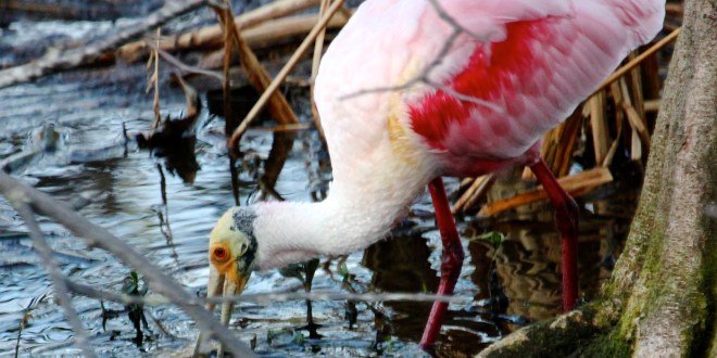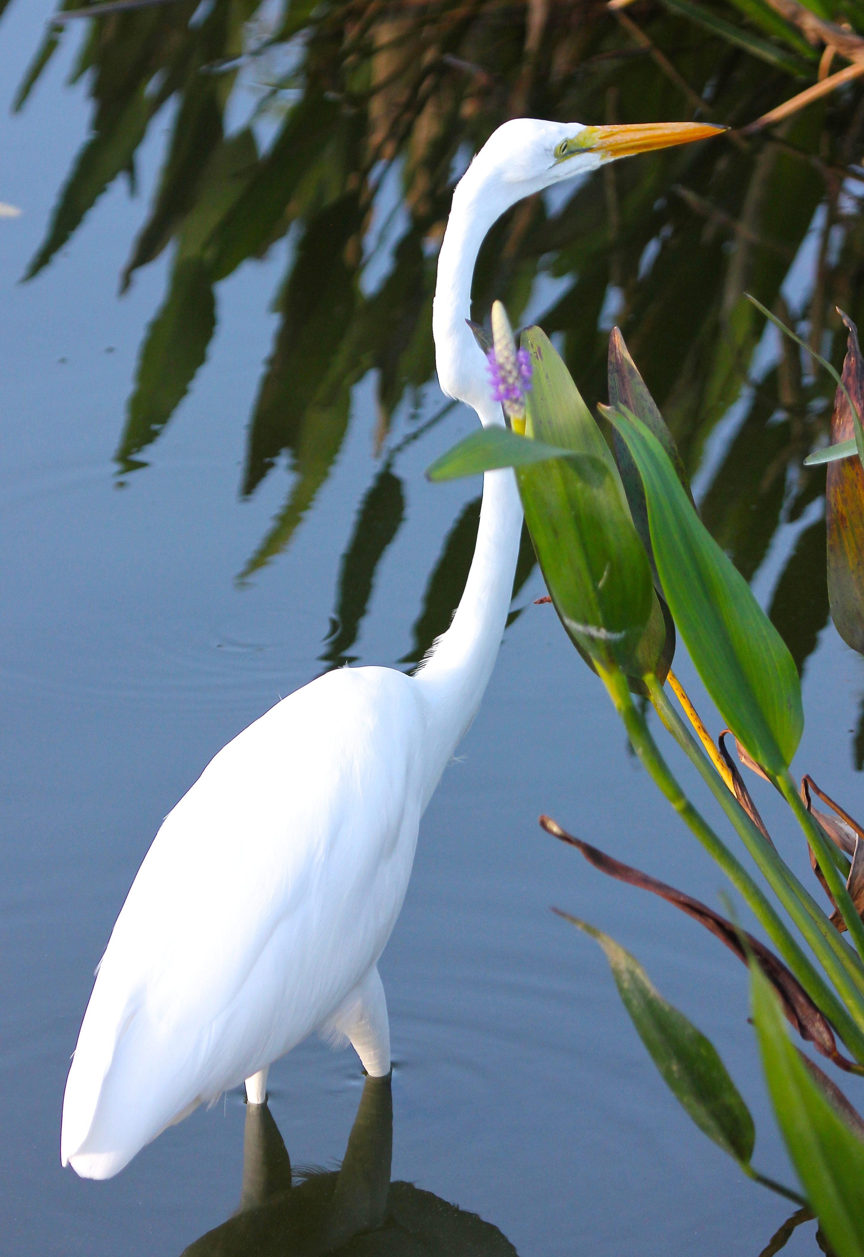 It is fascinating to observe the feeding behaviors of the large wading birds in our Wetlands. The Roseate Spoonbill featured above was using the steady, back-and-forth foraging motion this beautiful bird uses to find and capture its prey.IMG_1565Through a unique process called tactolocation, the Roseate feeds in shallow water by sweeping its large spoon-shaped bill from side to side. The bill snaps shut as soon as it comes into contact with small fish or other aquatic invertebrate, and voila ~ dinner!IMG_5076The Great Egret, on the other hand, strides out across the open, quiet water, neck extended, stopping every few moments to see who might be swimming below. The Egret has incredible patience and waits for just the right moment, always at the ready.IMG_1635Often with a subtle swaying of his neck or tilting of his head as a prelude, he suddenly lunges forward and plunks! his head into the water – and comes up with a treat in his long pointed beak.