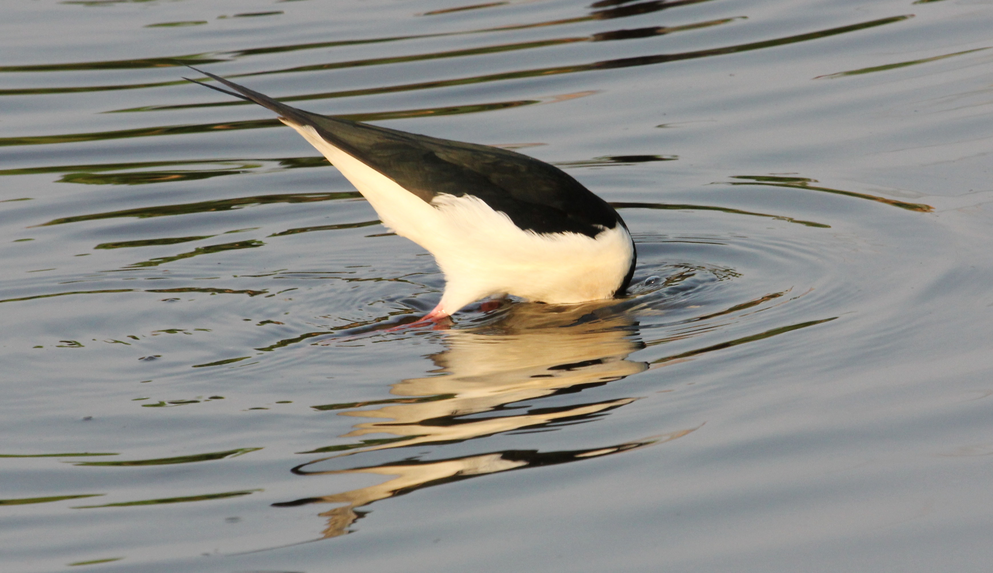 The water level is very low now, so this little Black-necked Stilt had no trouble finding teeny fish and other delicacies with his long pointy beak as he foraged for dinner last night at sunset.