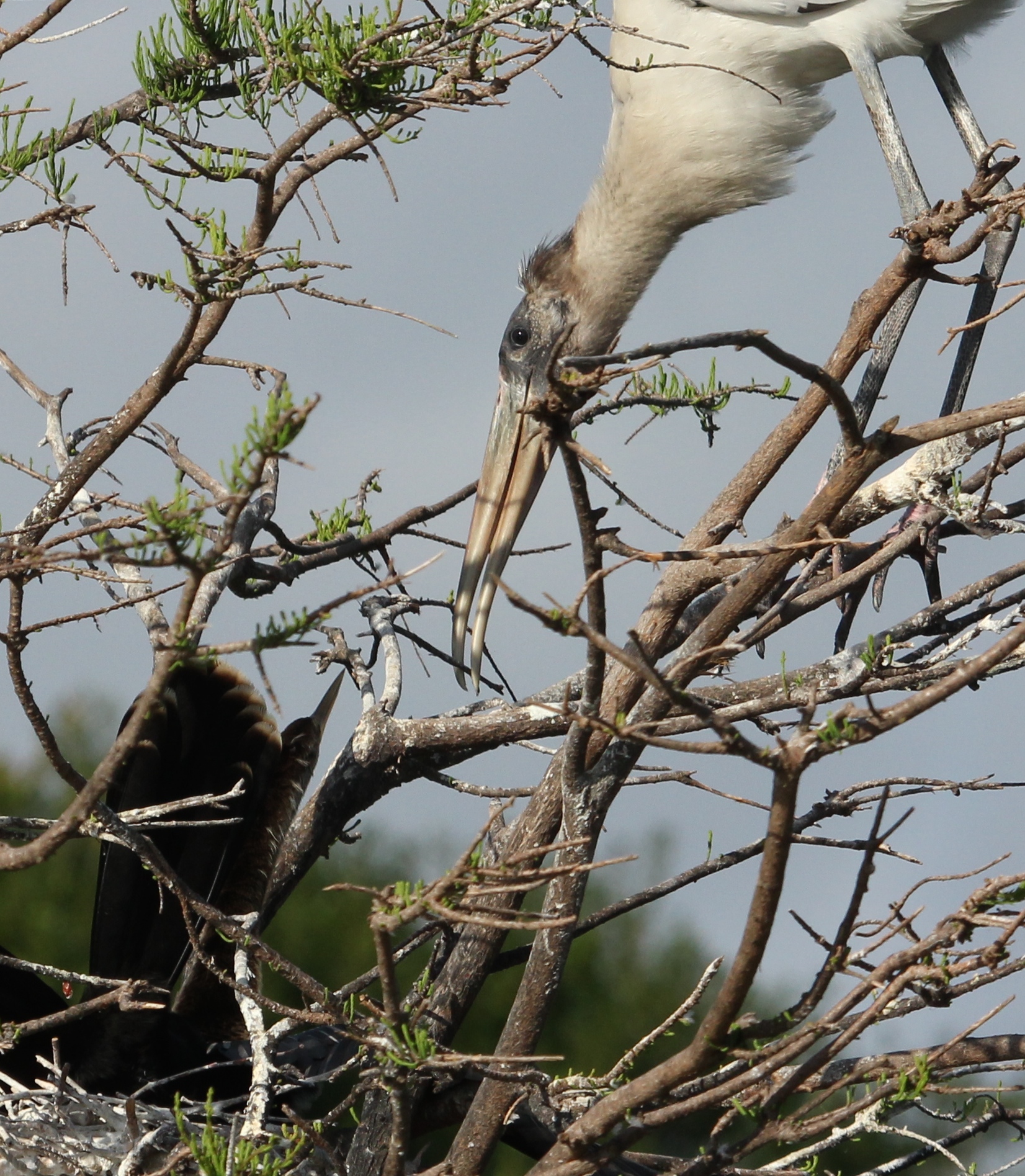 As time passed, the young Wood Stork appeared to convince the Anhinga that he was no threat – clearly, he was just stopping by to pick up some easy-access branches!