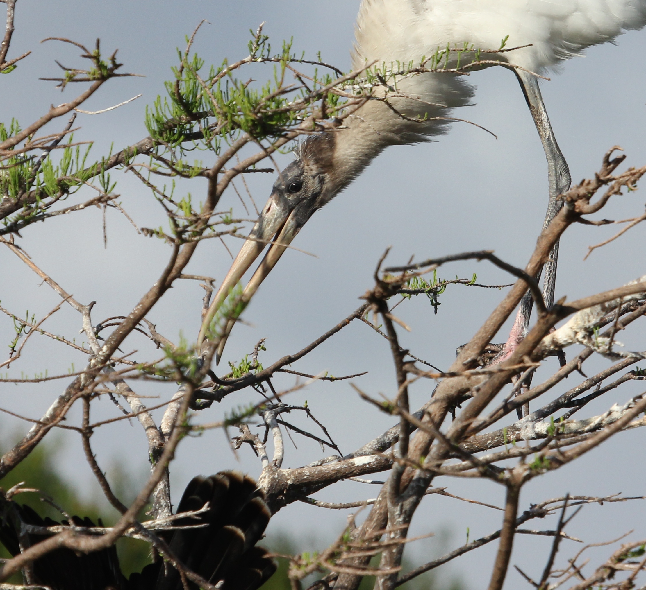 Shortly after the adult Wood Stork took off, a young Wood Stork decided to try out his flying skills and brave a short flight to the same high top branches. I couldn’t help but wonder if he was intentionally copying the adult, or if his tentative hops just accidentally landed him near the Anhinga and Cormorant nests. The young Wood Stork had to do some fancy footwork to keep his balance on those skinny branches.