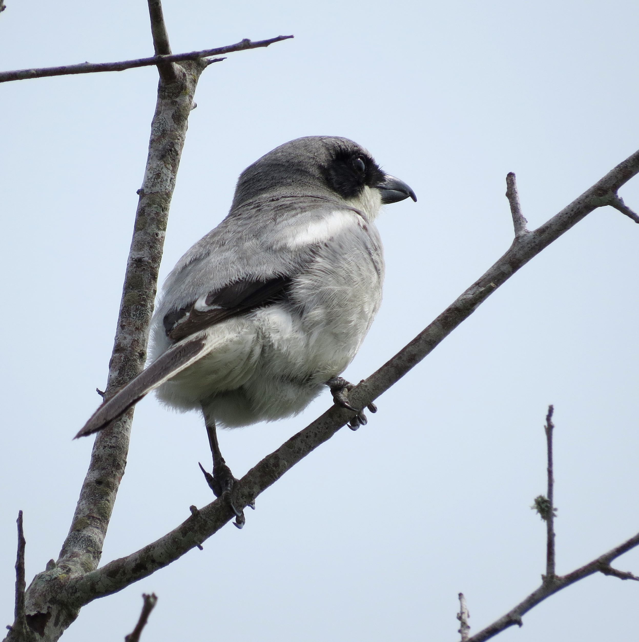 As I walked along the quiet, empty pathways, I heard an unfamiliar bird song coming from nearby. When I looked up at the exposed branches of a small narrow tree, I spotted an unfamiliar shape, looking the other way, and thought to myself, “Could that possibly be a Loggerhead Shrike!?”