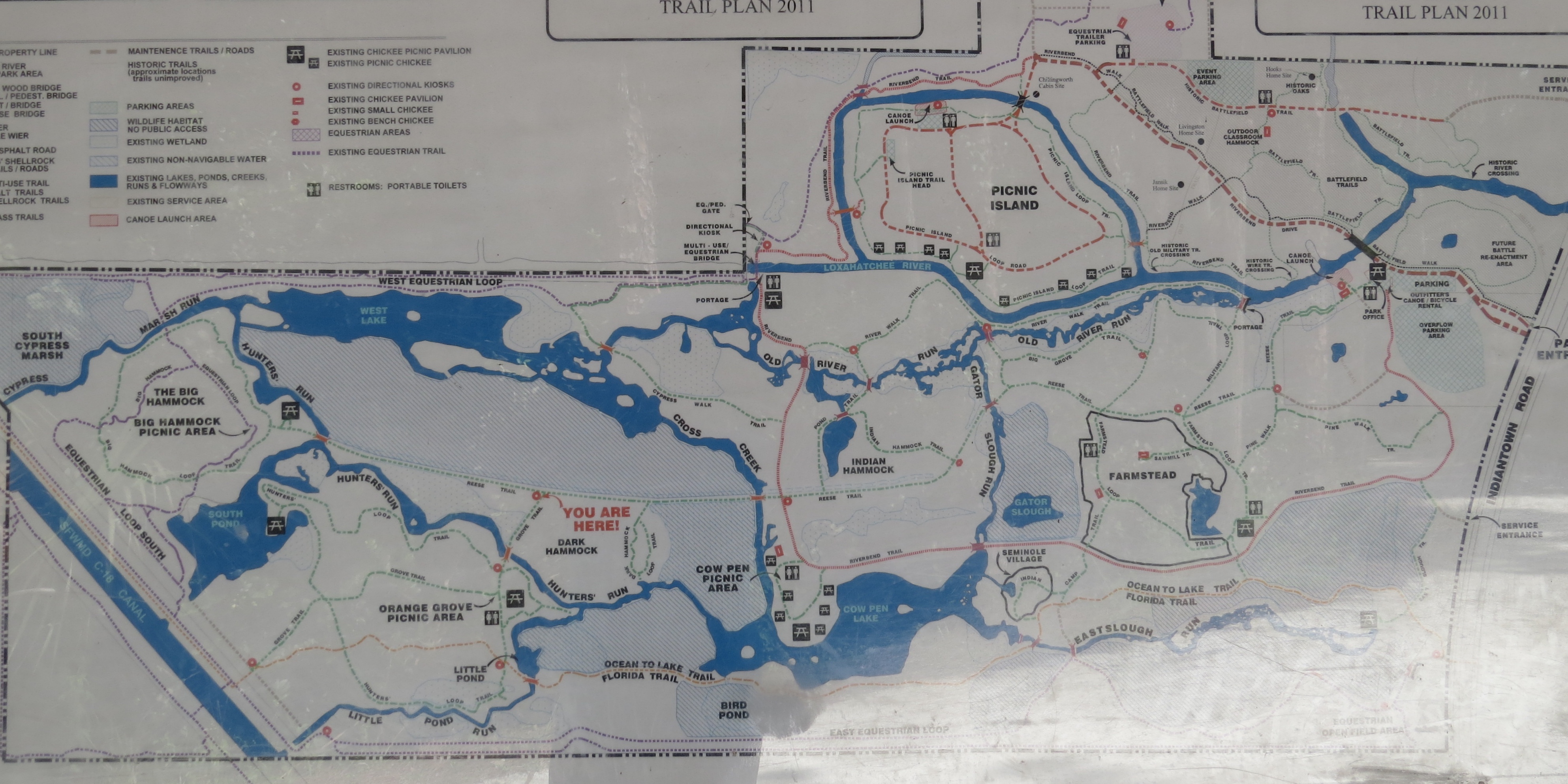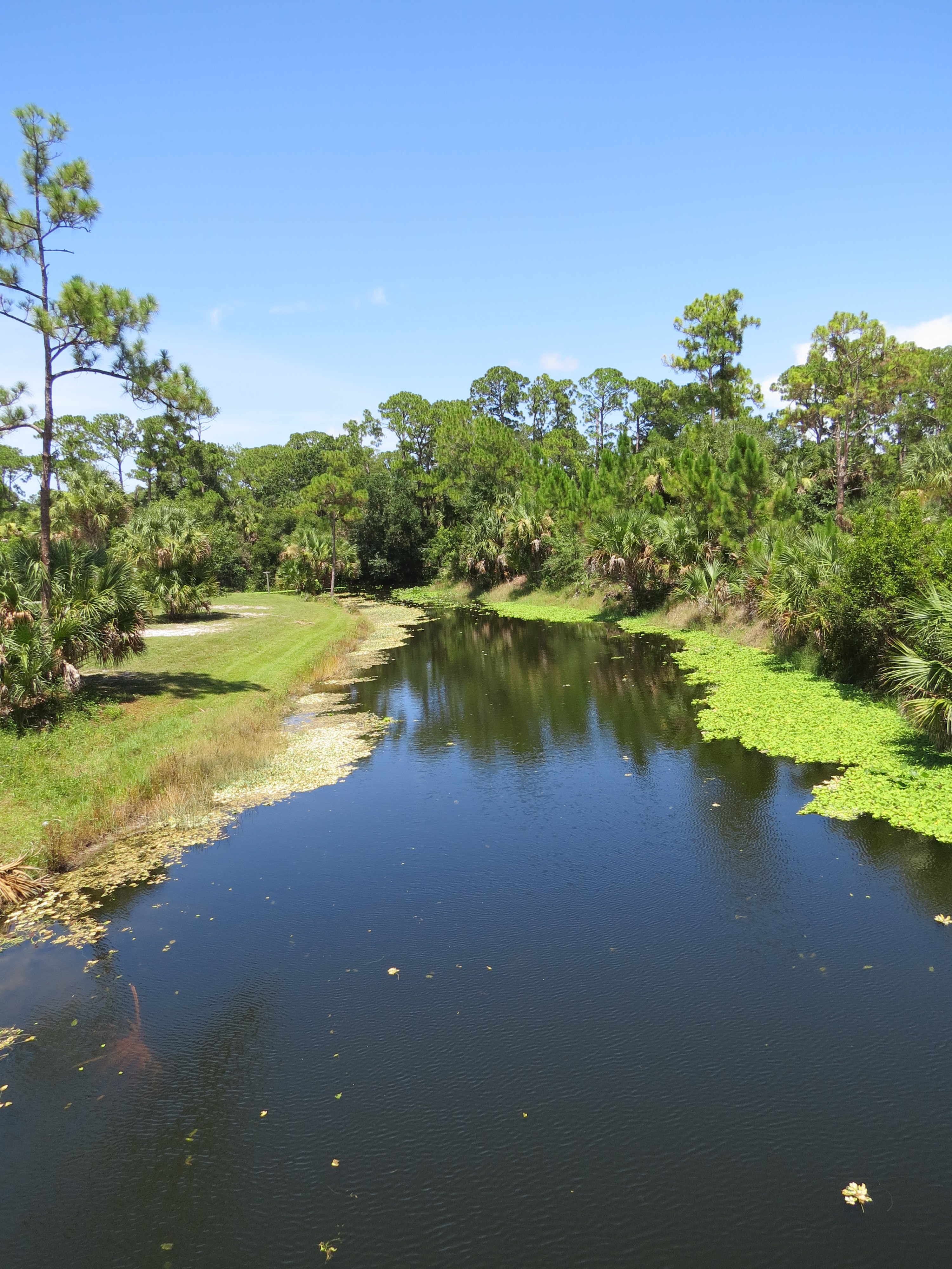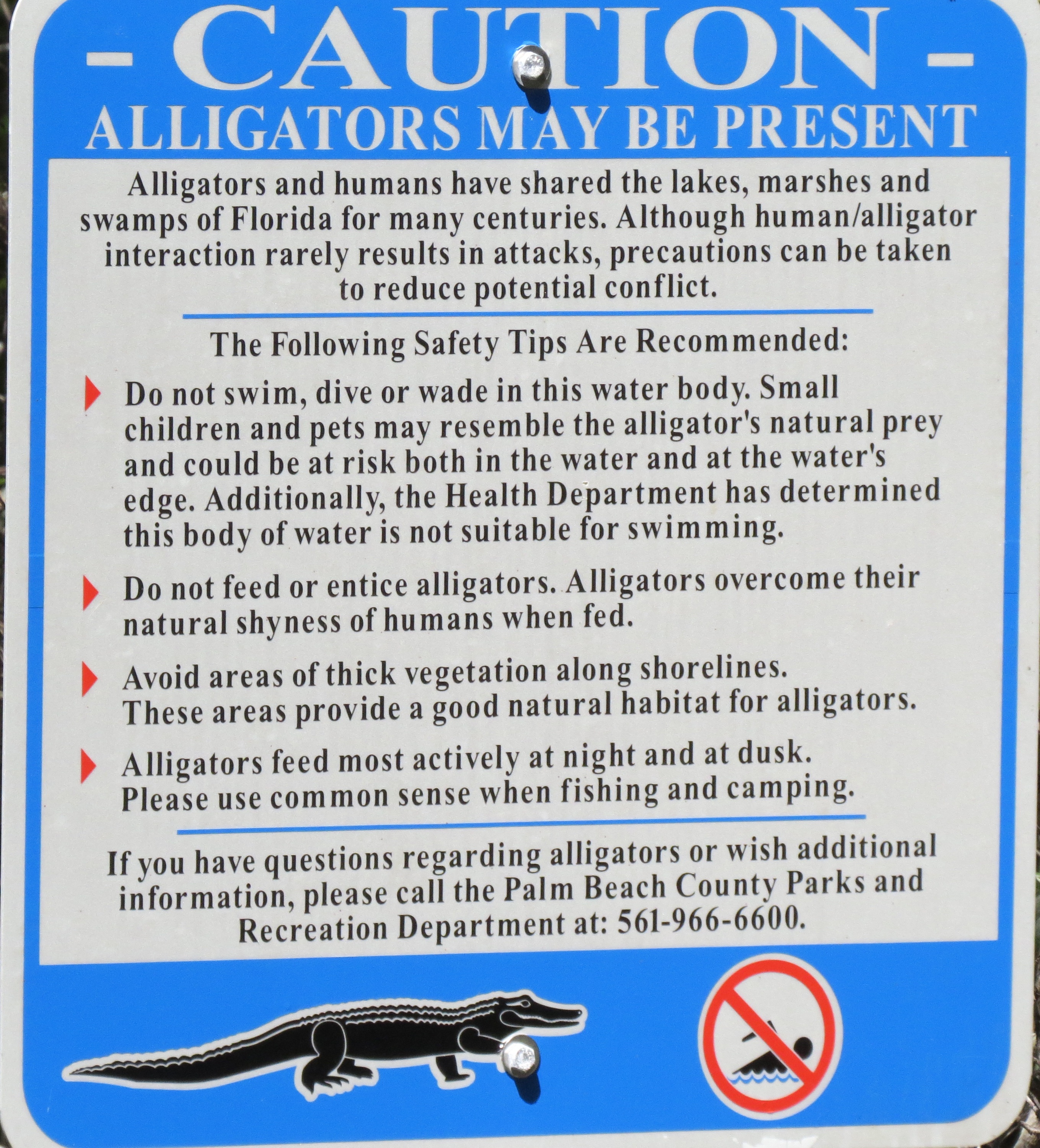 Uh-oh!! . . . We were hopelessly lost in this 665 acre park, and truly couldn’t fathom which way we’d come! Despite the warning signs, we did not see any alligators! But, we had no water, no phone, and it was mid-afternoon on a very hot summer day. Eventually, after wandering way off course, we came across a long, wide canal, which seemed to be outside the park.
