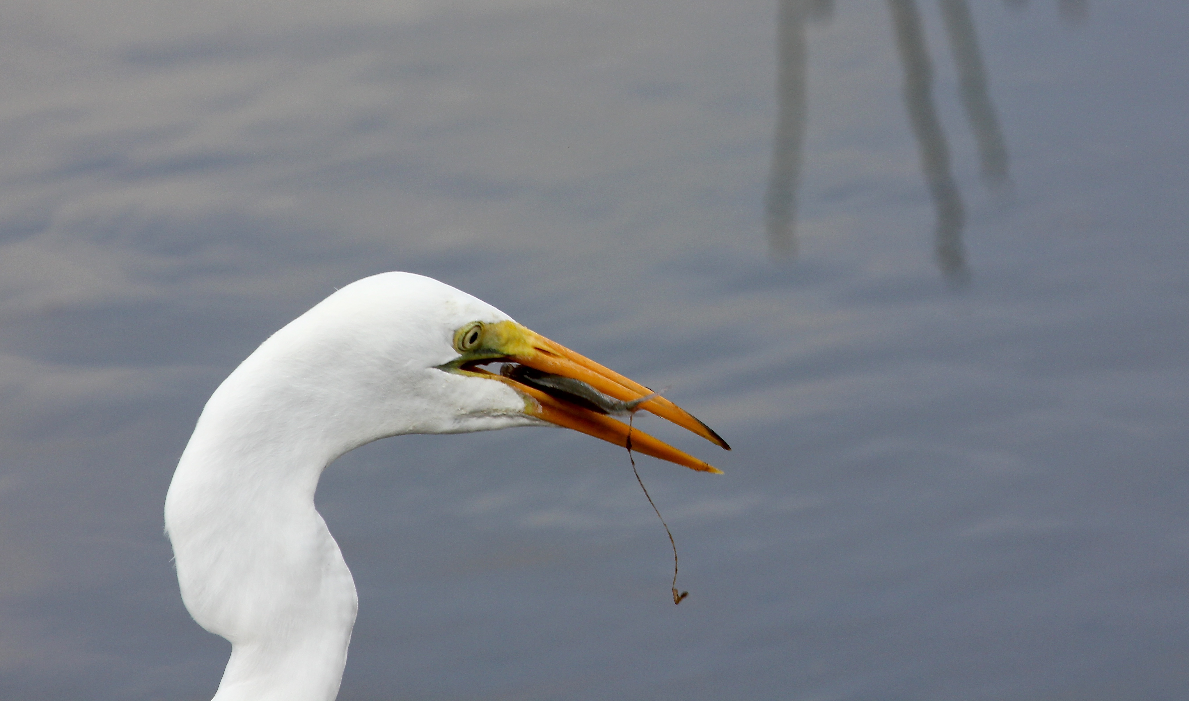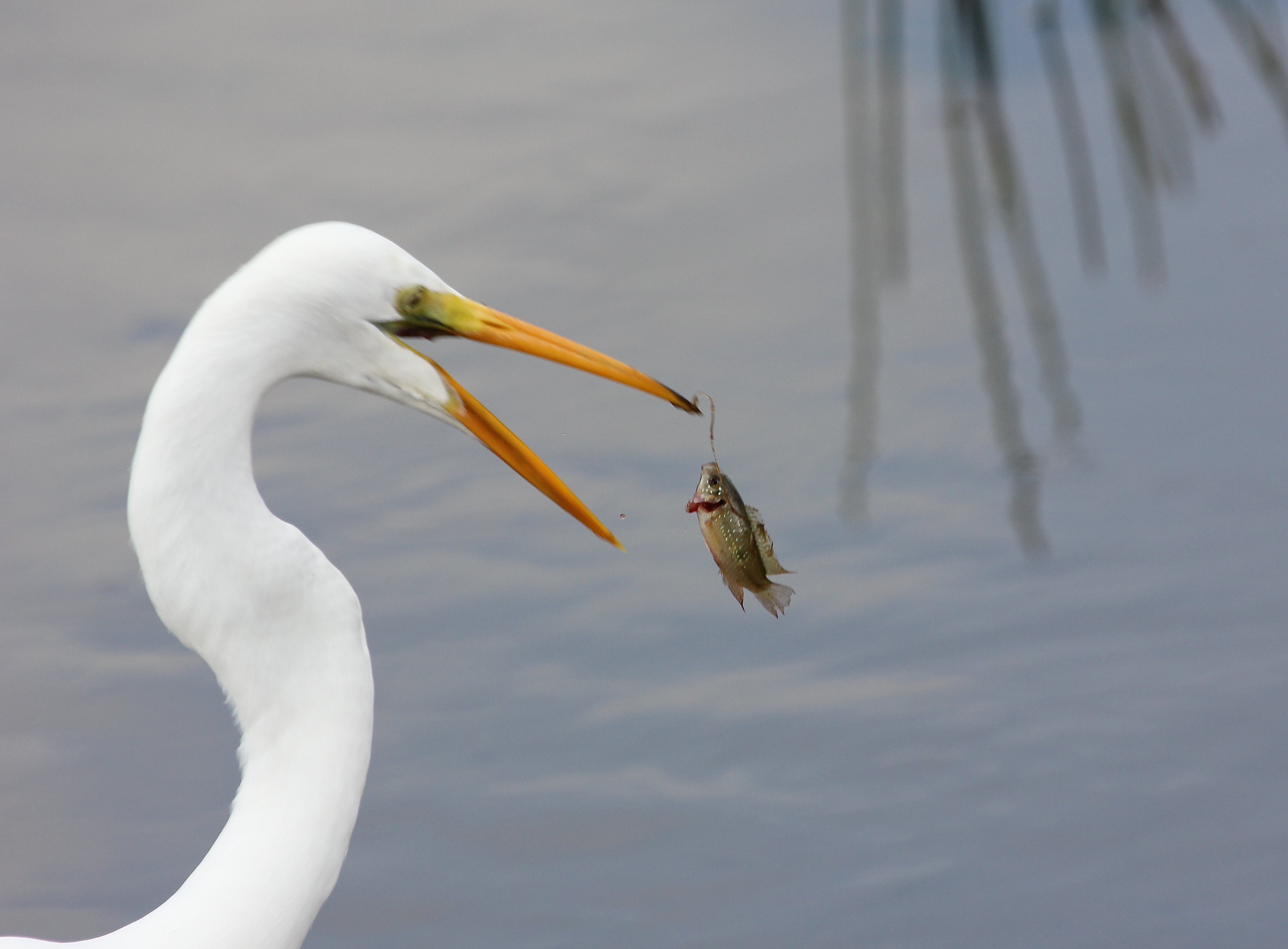 Did you ever have one of those moments when something happens so quickly that you have no idea what settings you have on your camera – you just point and shoot?IMG_6789Well, this morning, I was chatting with some folks about a Wood Stork in the pond, when all of a sudden I spotted this Great Egret, who had just caught a fish that very second.IMG_6790I had no idea what my camera was set on, but I couldn’t ‘let this one get away’.  Too bad I must have moved when he tossed it into the air!! Even though I would have liked the shots to have been much sharper, it was so fun to witness that I kept them all.IMG_6791I’d say no more than 2-3 seconds passed from the time I saw him till he swallowed that fish! All the photos in the sequence say 9:18 am 😉