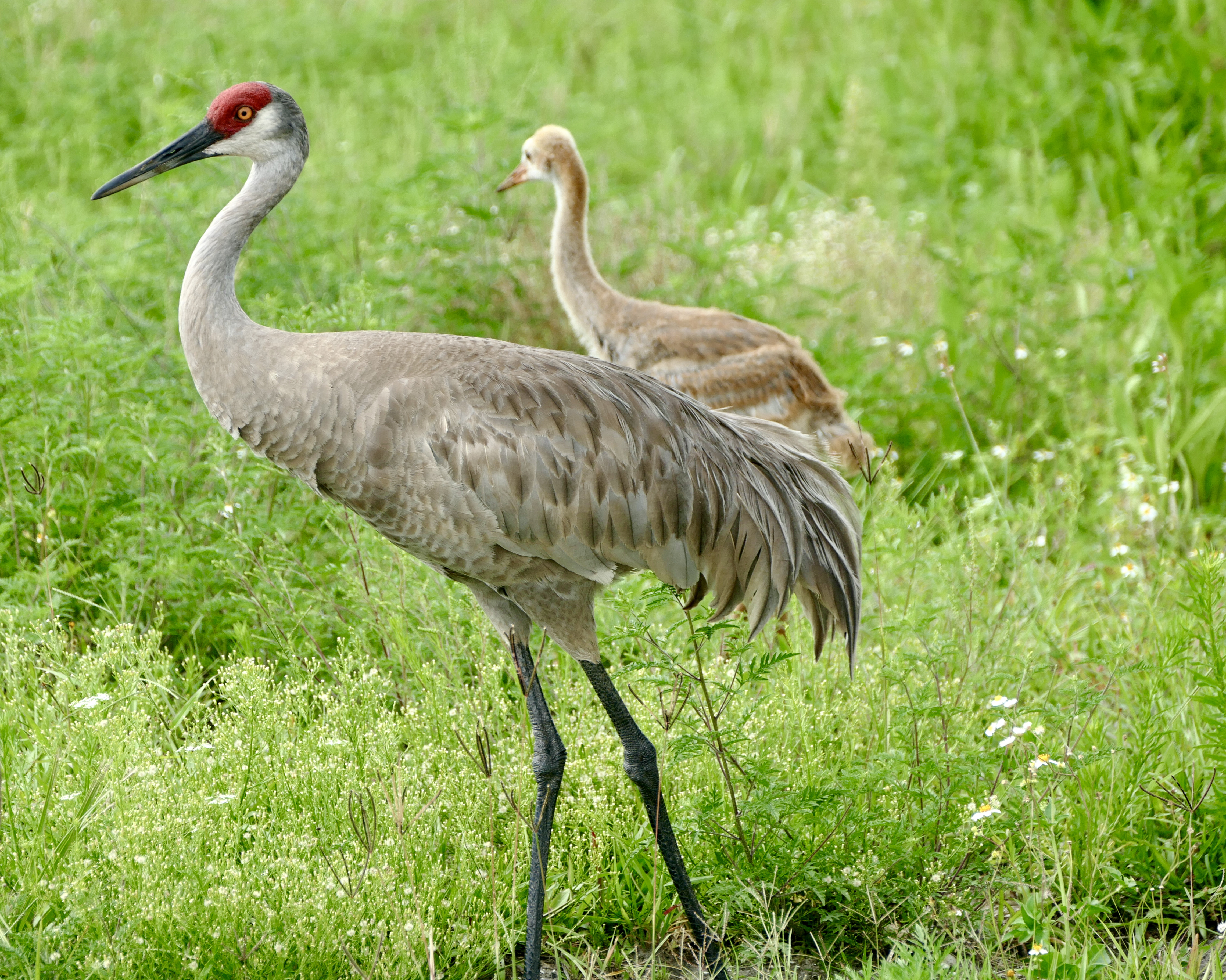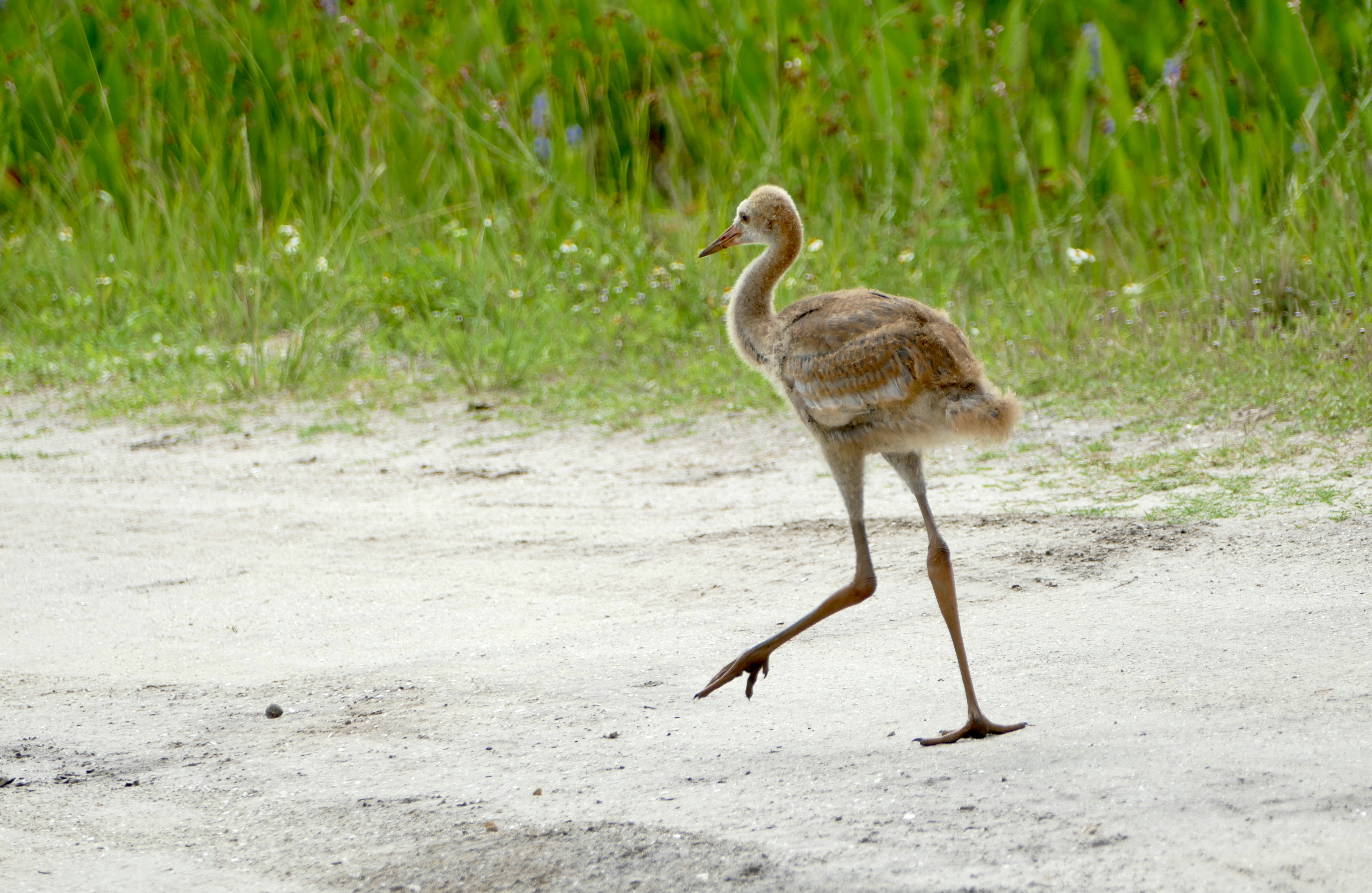 Sandhill Crane chicks can leave the nest about 8 hours after hatching (!) but, like this long-legged juvenile above, they stick very close to the parents till the age of about 9-10 months (All About Birds).