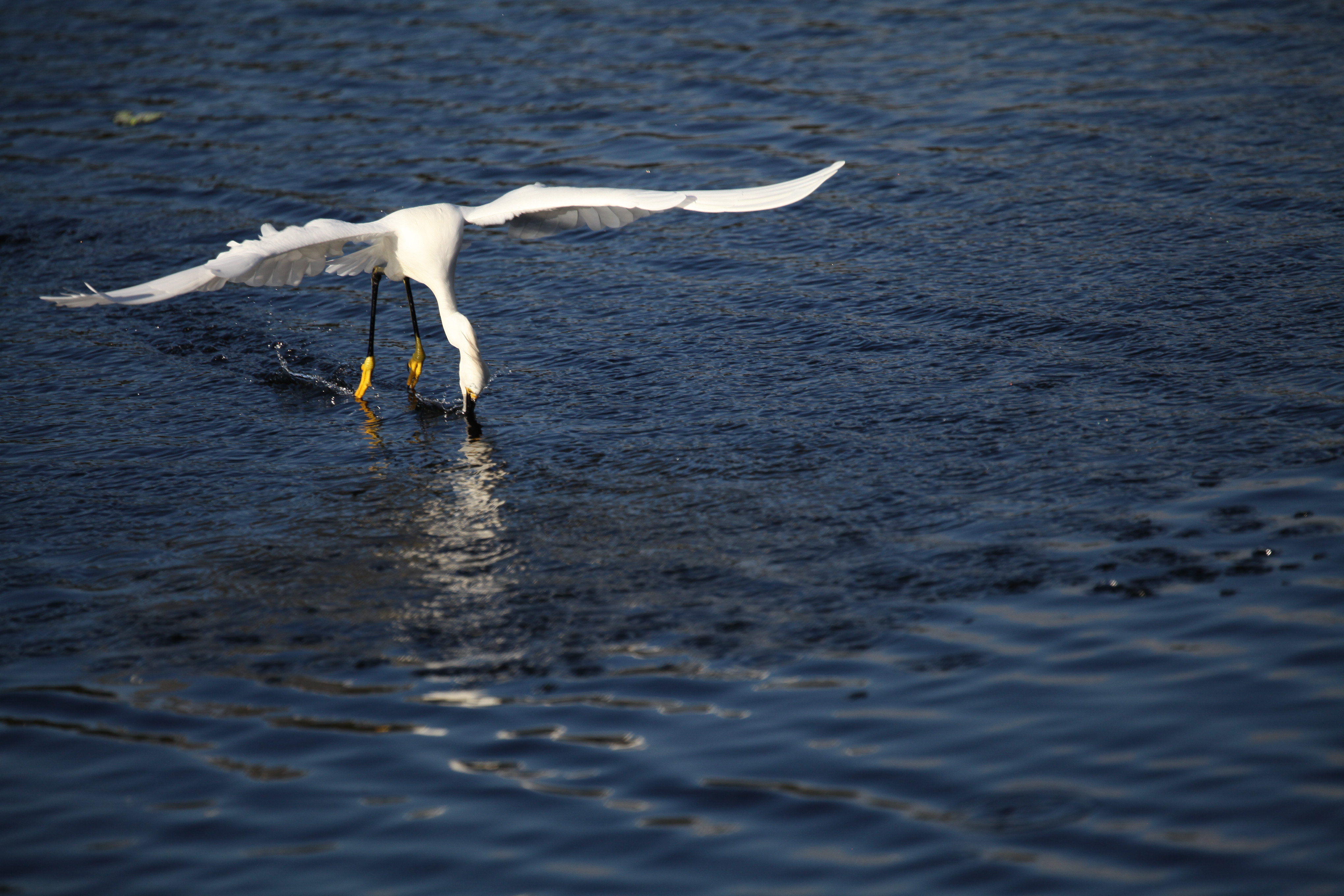 The Snowies can frequently be seen on little fishing expeditions at this time of year, flying back and forth over the water. They repeatedly swoop over the ponds, dragging their awesome yellow feet along the surface, and lean in to grab a tiny fish snack. When wading, they stir up the mud with their feet to flush out their prey.