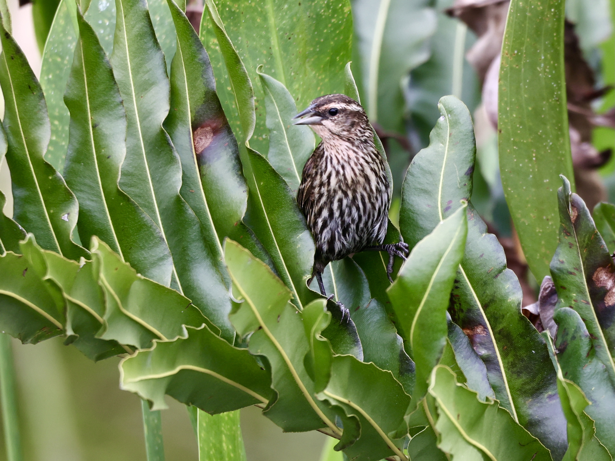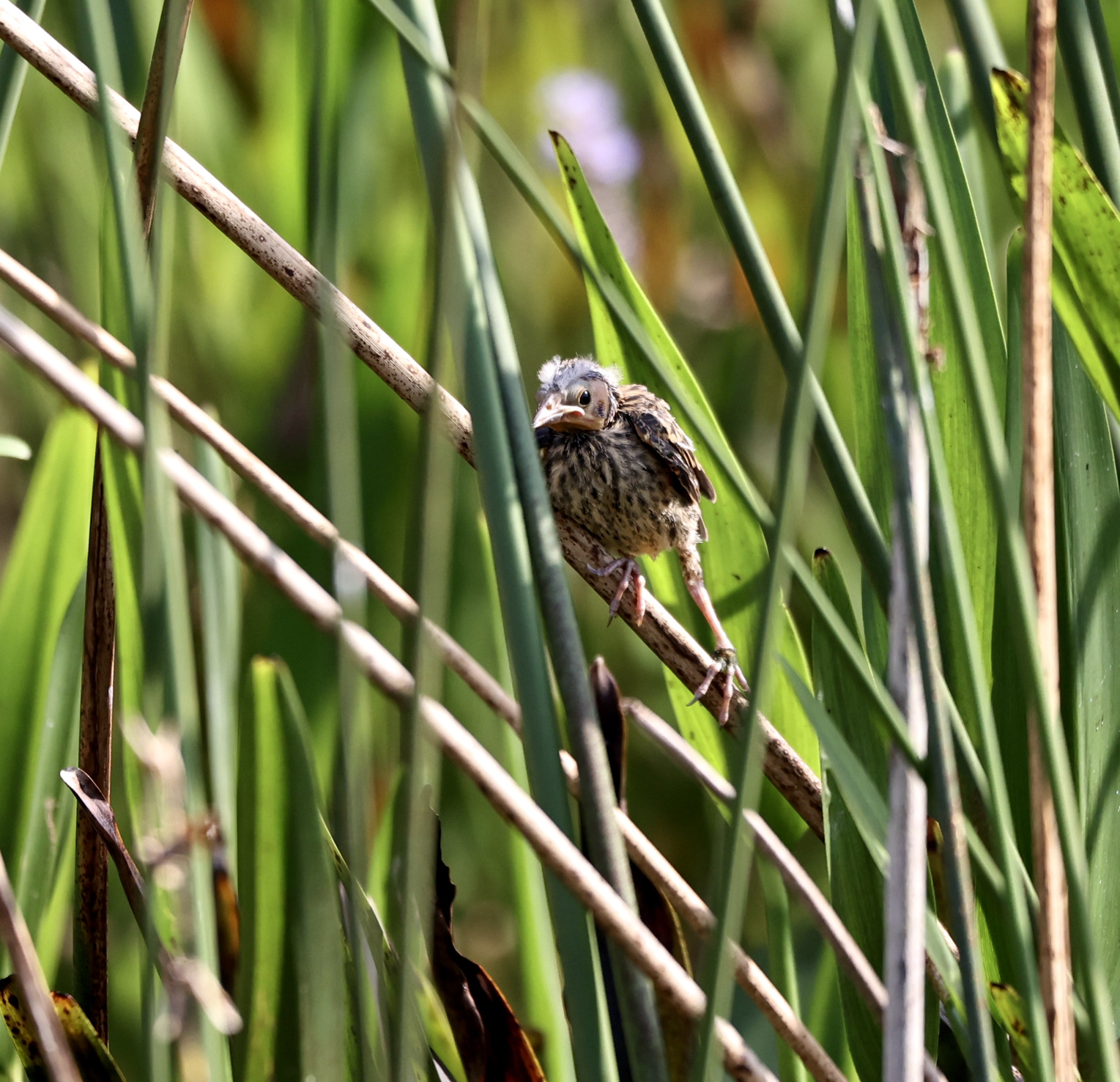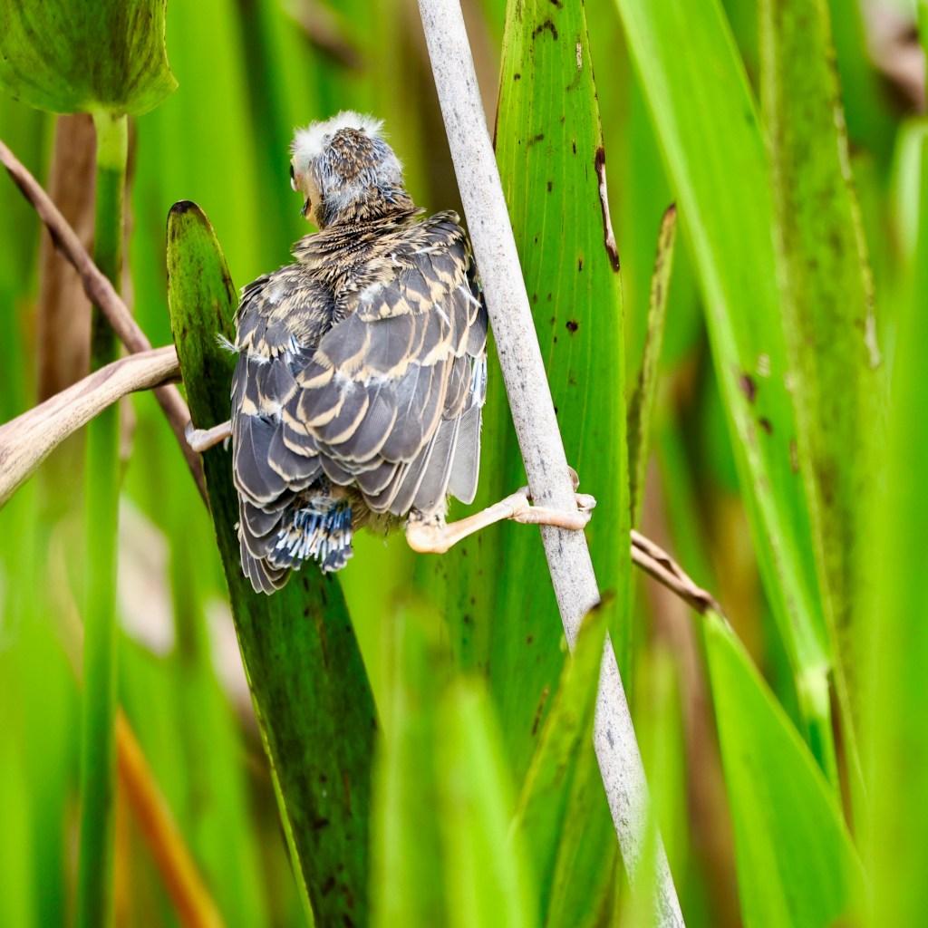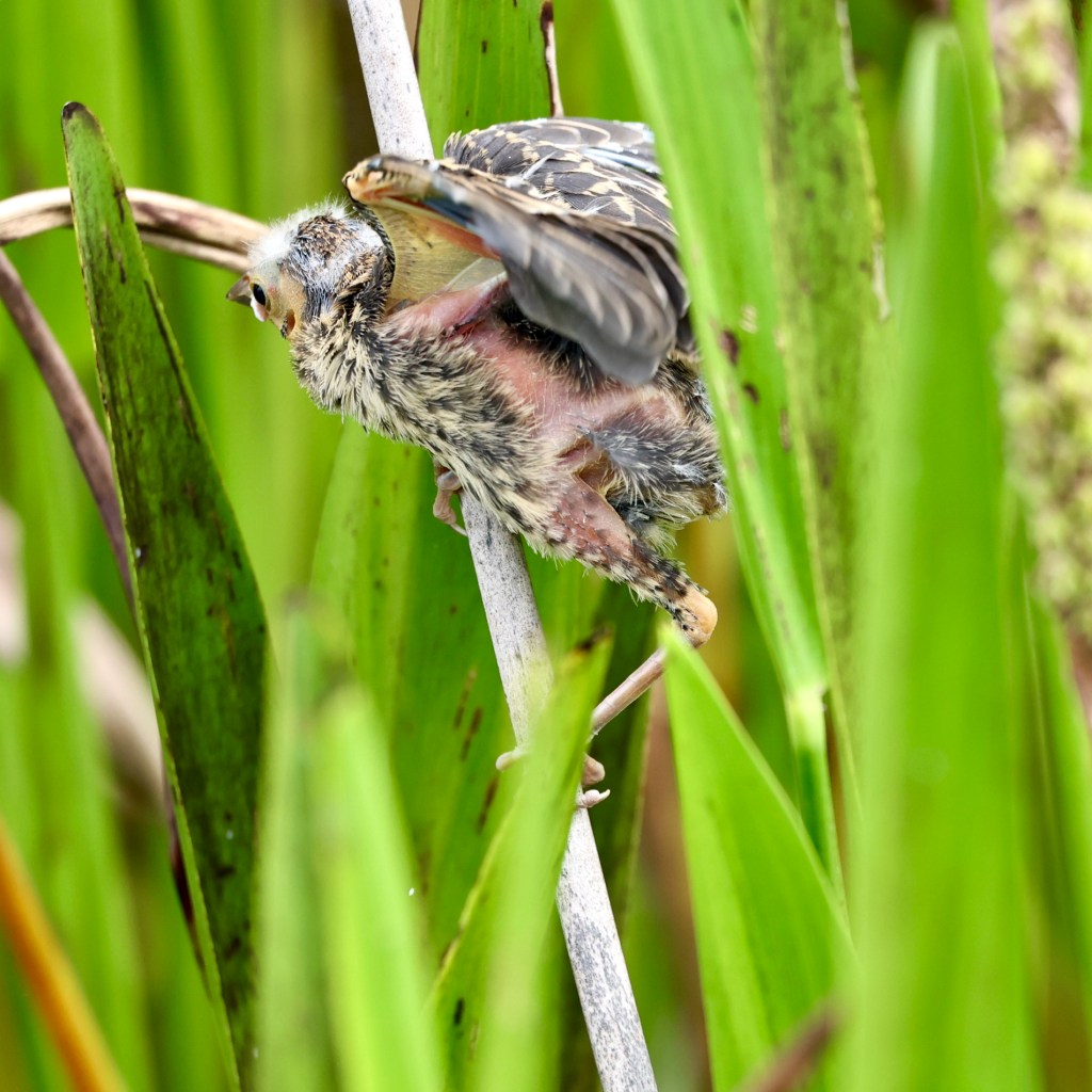 Less than a week ago, this tiny Red-winged Blackbird was still a newly hatched chick, mouth agape, begging for food. This week he’s fledged from the nest and is learning to climb up the marsh reeds on his own.