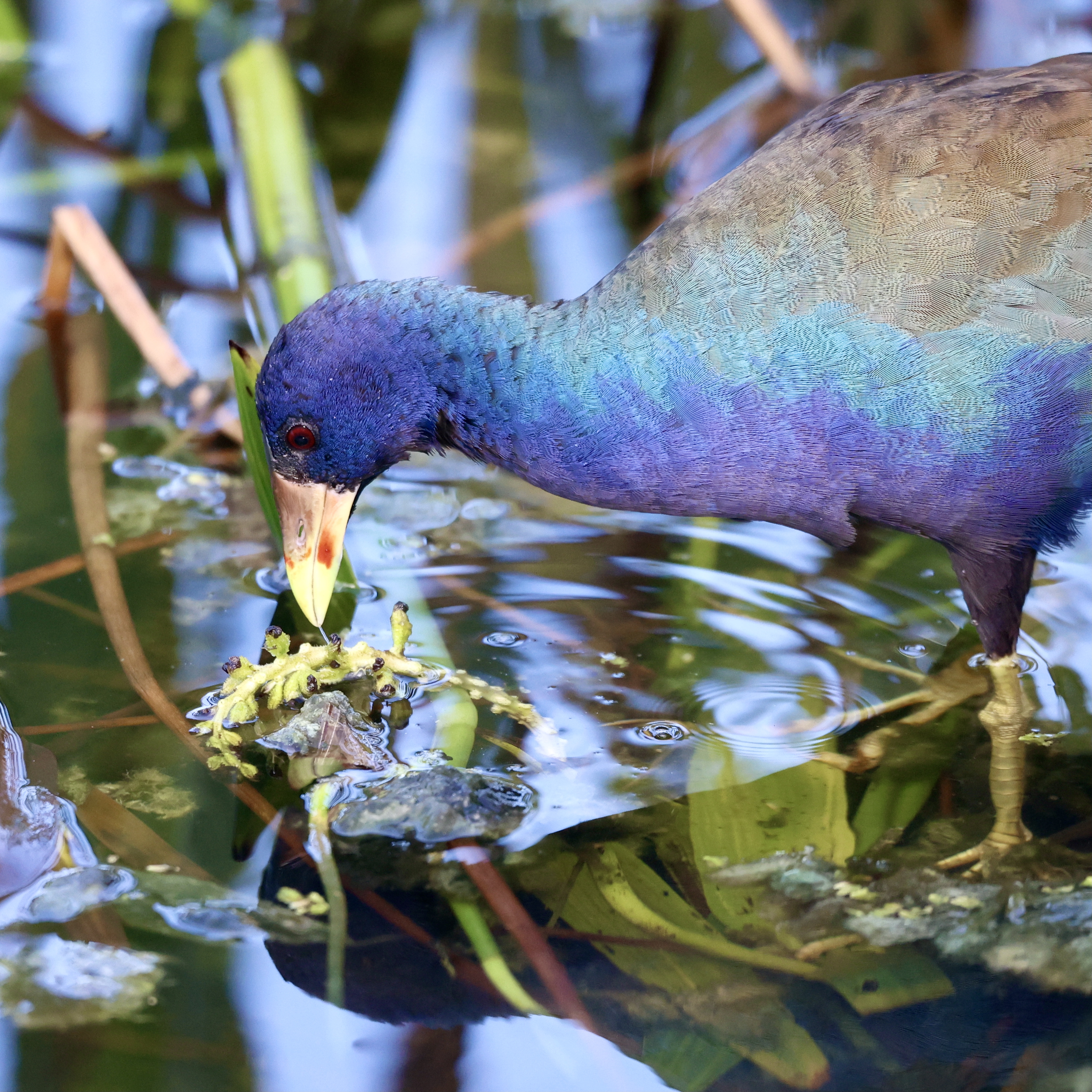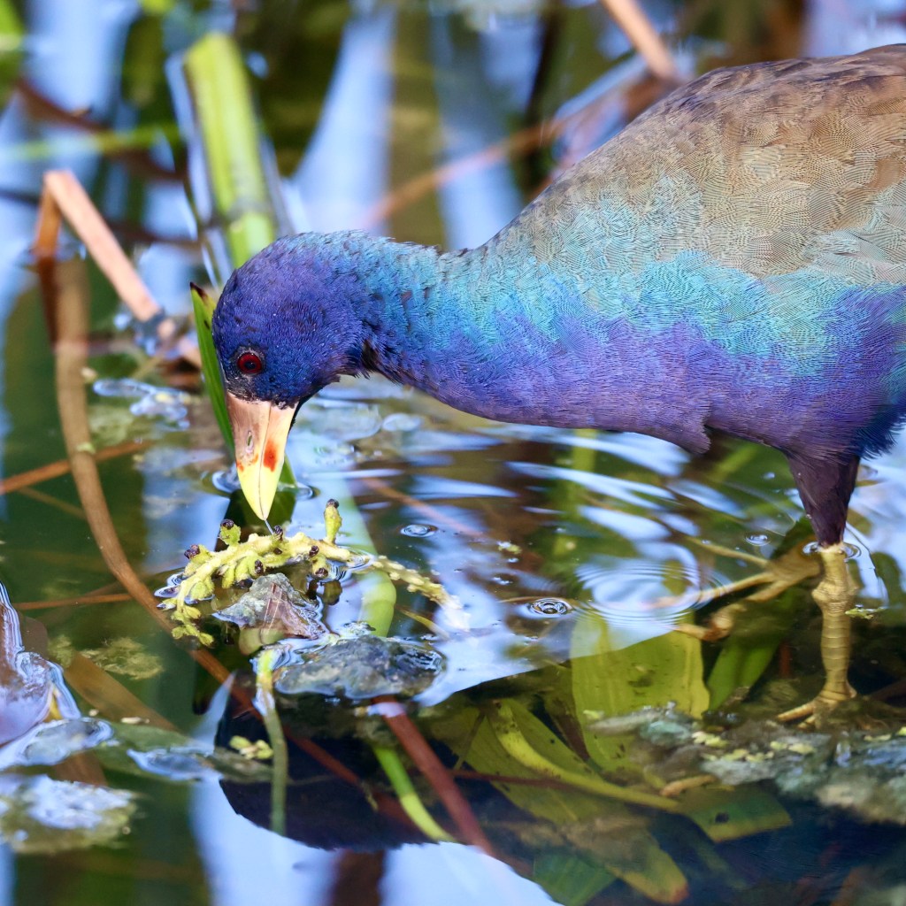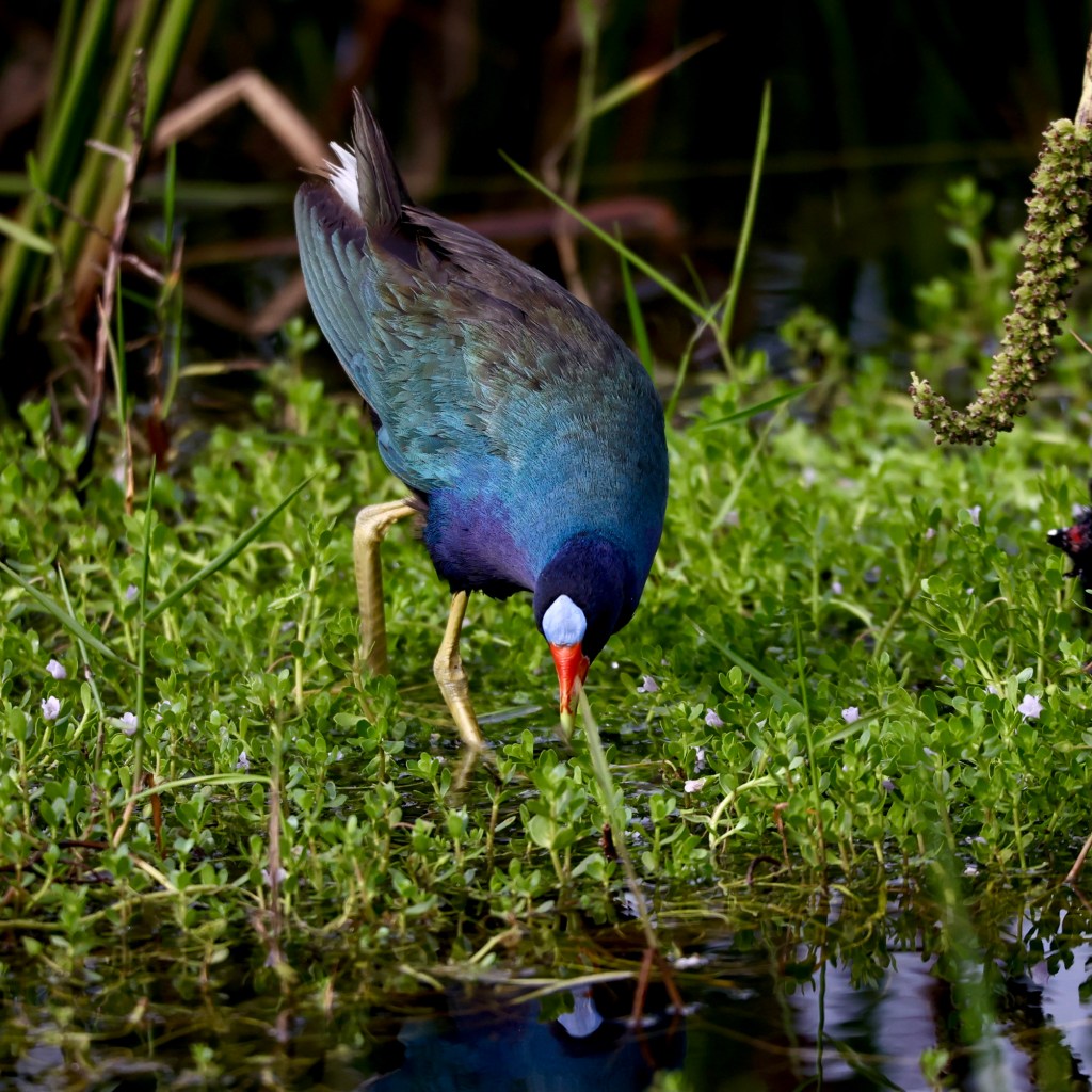 “Purple Gallinules combine cherry red, sky blue, moss green, aquamarine, indigo, violet, and school-bus yellow, a color palette that blends surprisingly well with tropical and subtropical wetlands.β