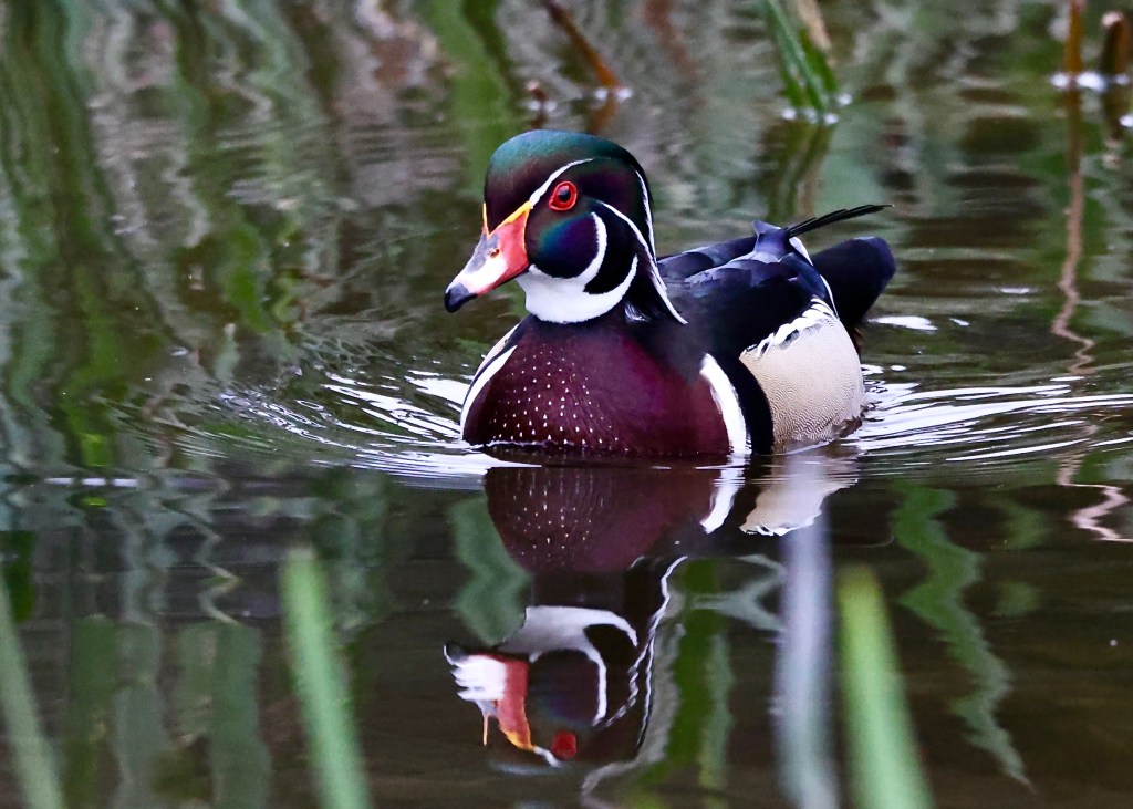 Wood Ducks owe their common name to the fact that they are one of the few waterfowl species that perch and nest in trees. Sharp nails on their webbed feet allow them to balance on branches and maneuver into tree cavities that they use for nesting.”