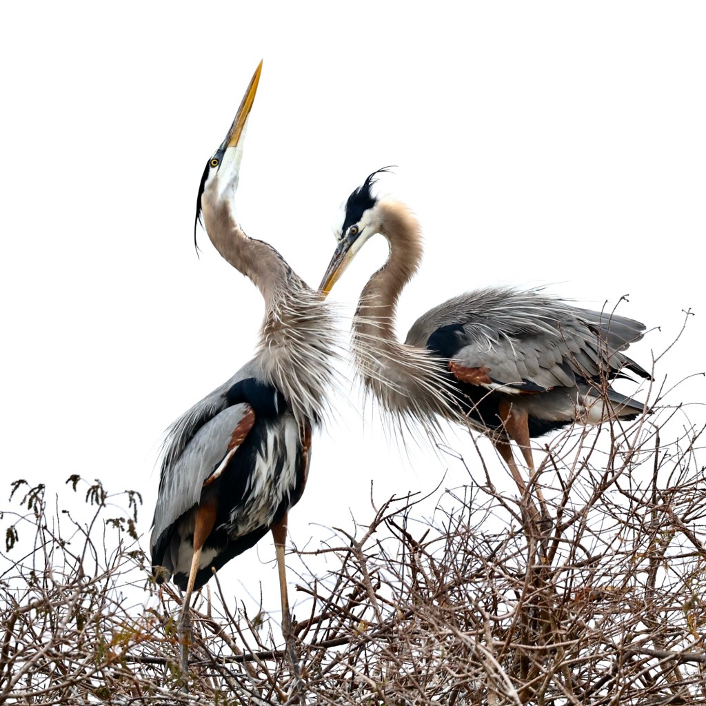 Great blue herons don’t mate for life, but they do have elaborate courtship rituals that help pairs form strong bonds. Their mating displays include bill snapping, neck stretching, moaning calls, preening, circular flights, twig shaking, twig exchanging, crest raising and even bill duels.” (Sciencing)