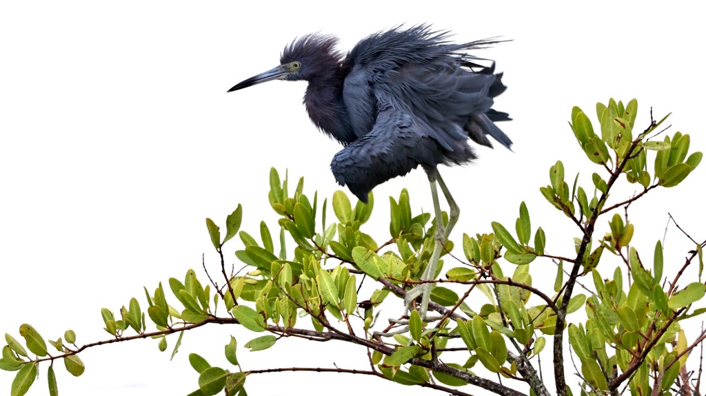 I’ve always been partial to Little Blue Herons, the elegant wading birds who are entirely white as juveniles, then gradually develop patches of blue plumage until they mature into entirely blue adults. (All About Birds – Little Blue Heron).